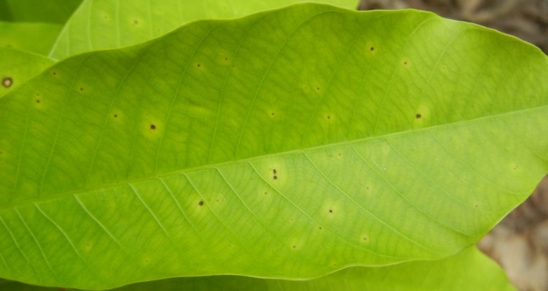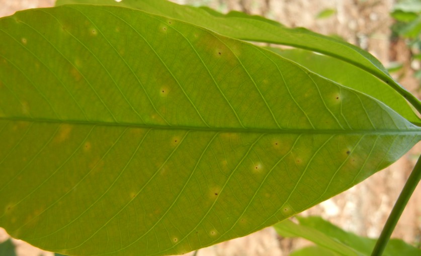为害症状与橡胶树麻点病的相似。叶片感病后,最初出现黄色小斑点,随后扩展到直径1~3mm的圆形或近圆形褐色斑点,外围有黄晕。与橡胶树麻点病不同的是,未发现该病害后期病斑中央呈灰白色,略透明,边缘褐色。