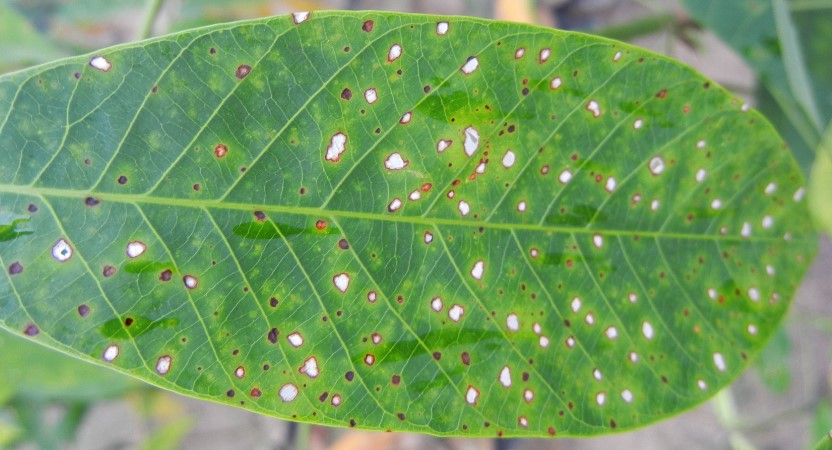 该病在橡胶树叶片上形成的病斑小而多,较密集。不同叶龄叶片发病后所表现的症状有所不同。古铜叶症状:出现暗褐色水渍状小斑点,重病叶片皱缩,变褐枯死,脱落。淡绿叶症状:最初出现黄色小斑点,随后扩展到直径1~3 mm的圆形或近圆形病斑。病斑中央灰白色,对光略透明,边缘褐色,外围有黄色晕圈。叶片老化后,有些病斑中央出现穿孔。接近老化的叶片染病后,叶片只出现深褐色小点。有时顶梢由于多次落叶引起畸形肿大。叶片主脉、叶柄及嫩枝条发病,只出现褐色条斑。潮湿情况下,病斑背面长出灰褐色霉状物。