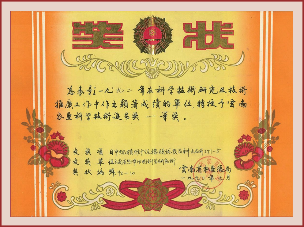 授奖级别 云南农垦科学技术进步奖一等奖