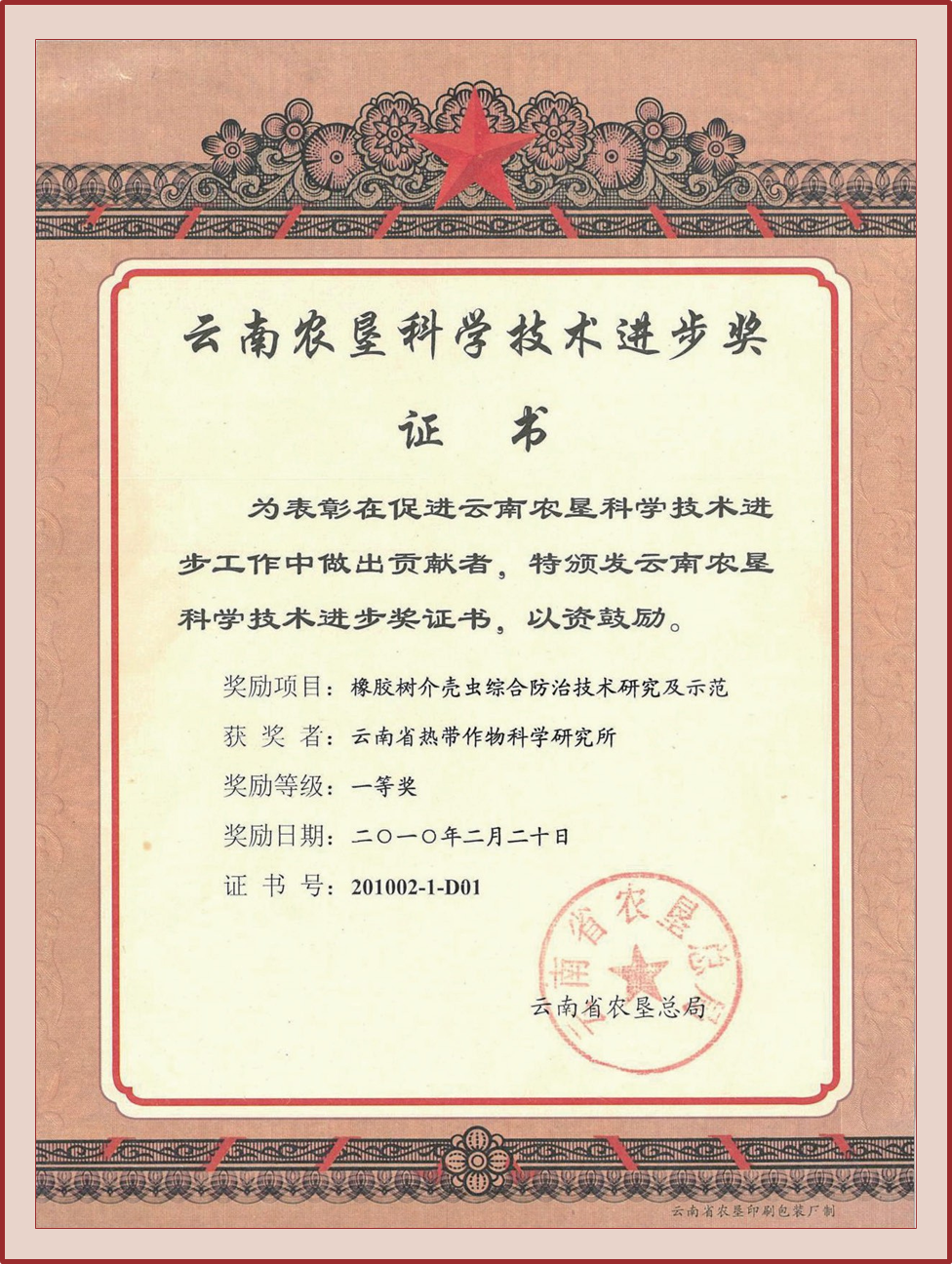 成果简介 本项目鉴定出云南大面积为害橡胶树的介壳虫为橡胶盔蚧(Parasaissetia nigra Nietner),属蚧科,副盔蚧属。发现橡胶盔蚧在西双版纳地区1年发生3~4代,出现3~4次虫口高峰,在橡胶树上的空间分布为聚集分布。基本掌握了橡胶盔蚧生物学特性、生活史、发生为害规律和特点,提出橡胶盔蚧卵孵始盛期的测报方法。发现橡胶盔蚧捕食性和寄生性天敌31种,捕食性天敌的优势种为晋草蛉,寄生性天敌的优势种为川上座壳孢、优雅岐脉跳小蜂和绵蚧阔柄跳小蜂;对优雅岐脉跳小蜂的部分生物学特性进行了研究并成功饲养。筛选出杀扑磷、蛛八蚧、杀蚧、氧化乐果等4种对橡胶盔蚧若虫有较好防效的杀虫剂,研制出2种热雾剂。提出防治措施和防治策略。建立中幼林水剂防治试验示范面积5 100亩,对1、2龄若虫防效达94%以上;建立开割林热雾防治试验示范面积10 000亩,对1、2龄若虫防效达87%以上;建立综合防治试验面积23759亩,对1、2龄若虫的平均累计防效达80%。累计辐射面积50余万亩,挽回干胶损失12 216 t,挽回经济损失19 860万元。橡胶盔蚧在西双版纳的为害面积由2004年的61万亩,2006年下降到34万亩。