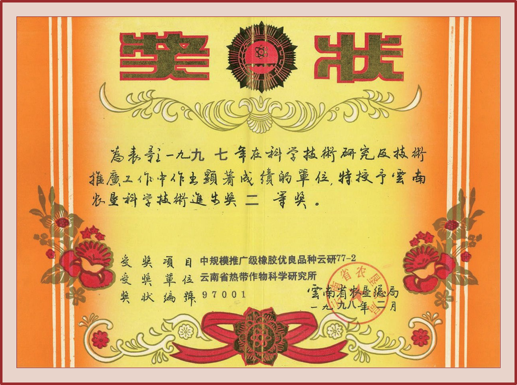 成果简介 ‘云研77-2’抗寒高产。其杂交亲本为‘GT1’× ‘PR107’,母树是从海拔1 300 m的思茅前哨点经-0.9℃低温选出,无性系又受0.6℃低温考验,抗寒力较强。1978年参加初级系比,1982年建高级系比,1988年扩大生产试种。1990年全国橡胶品种汇评评为试种级,“八五”期间评为小规模推广级,1997年5月云南省农垦总局品系汇评,评为中规模推广级品种。“九五”继续列为全国橡胶攻关指标品种研究。经系统的观察鉴定,产量、抗性均属优良,属抗寒高产型品种。