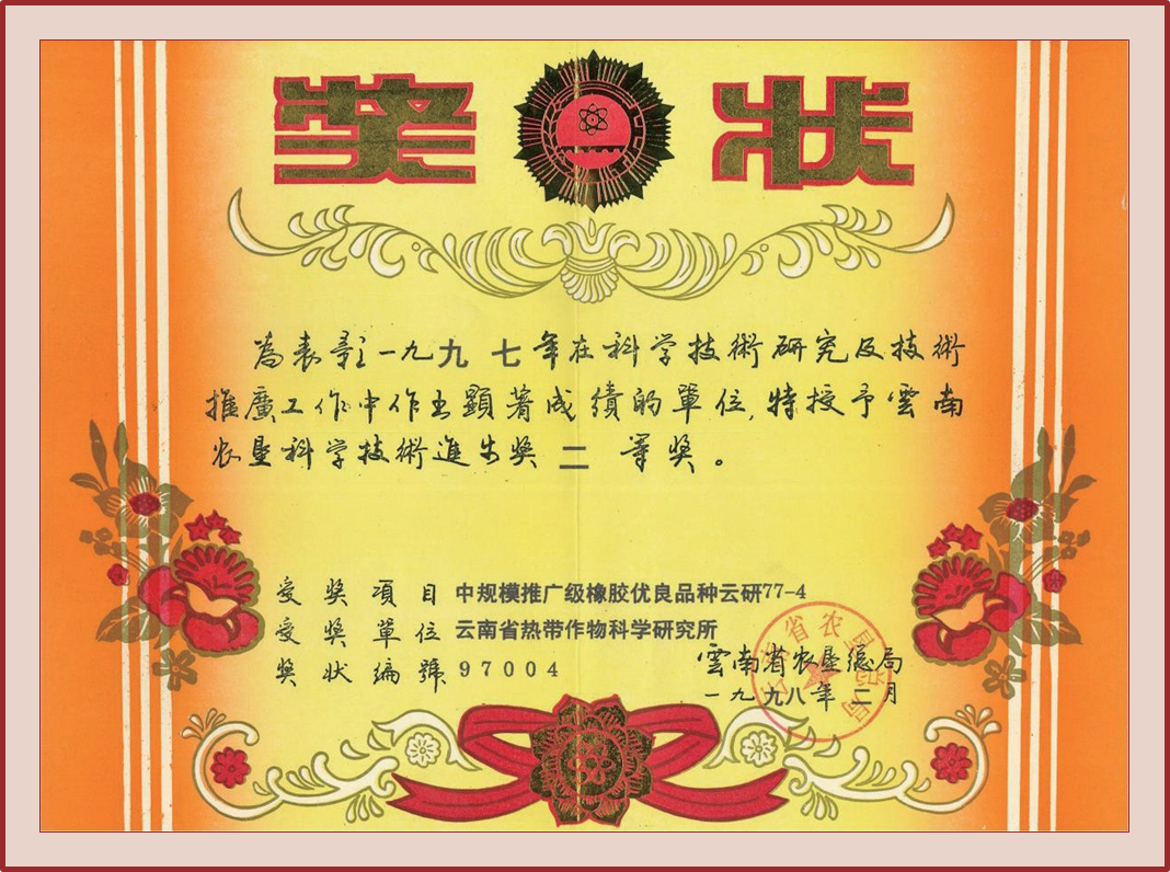 成果简介 ‘云研77-4’抗寒高产。其杂交亲本为‘GT1’× ‘PR107’。在杂交苗中通过抗寒和产量预测,选抗寒力强、产量高的优良个体繁育无性系,再把无性系作抗寒力鉴定,从而进行初级系比、高级系比和多点适应性栽培试验。1990年,全国橡胶品系汇评评为试种级,“八五”期间评为小规模推广级,1997年5月,云南省农垦总局橡胶优良品系汇评,评为中规模推广级品种。“九五”继续列为全国橡胶攻关指标品种研究。经系统的观察鉴定,产量、抗性均属优良,属抗寒高产型品种。