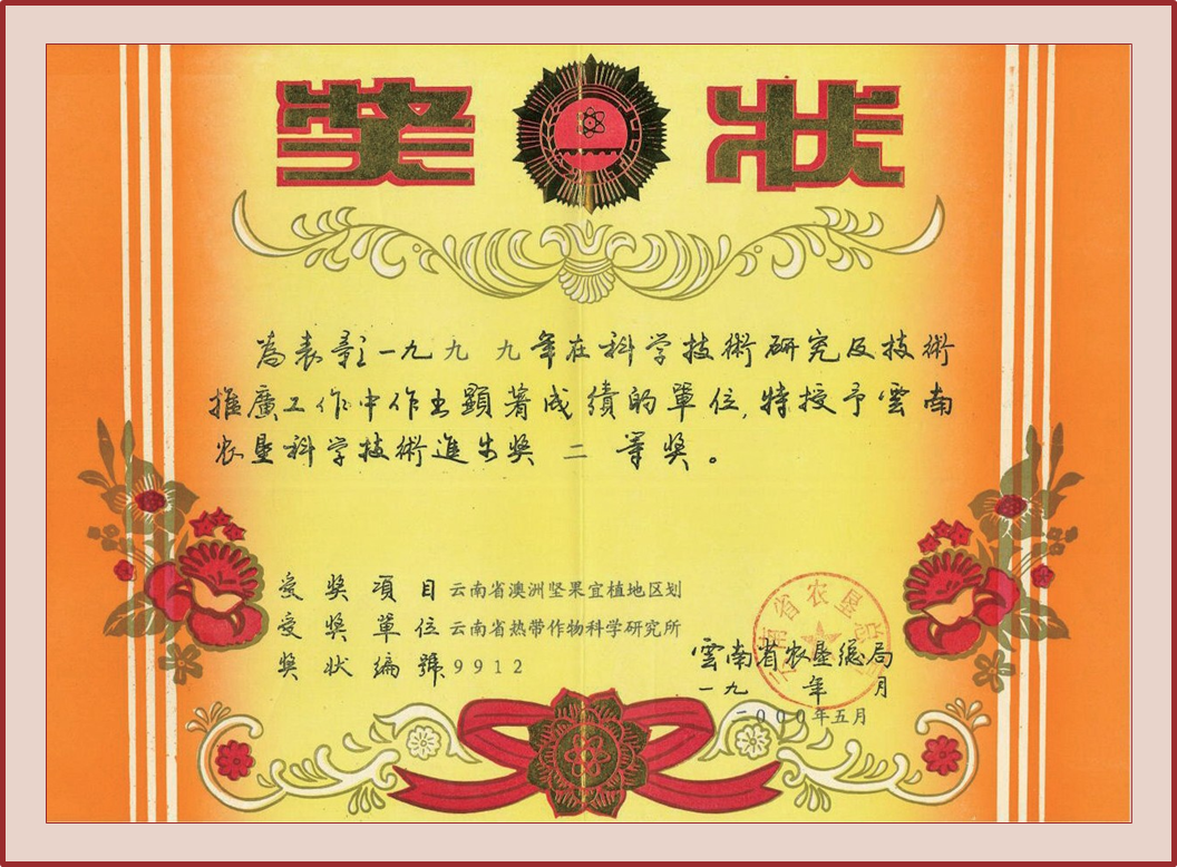 成果简介 本项目对国外澳洲坚果原生地、主产地、国内试种地区的气象、土壤条件及澳洲坚果的生长发育、产量等资料进行了调查、收集、整理分析,以澳洲坚果生长发育过程中的营养生长期、花芽分化与开花期、果实生长期等几个关键时期及关键时期的主导气象因子,即年平均气温、年平均干燥度、多年平均最低气温、各月平均气温、11月至翌年4月平均最低温度,采用模糊数学统计分析法,明确了云南省种植澳洲坚果最适宜、适宜、次适宜的地区,并绘制出宜植地分布图和计算出土地资源面积。其中,最适宜和适宜区主要分布在西双版纳州、思茅、临沧地区及红河、德宏州。为云南澳洲坚果产业发展规划和宜植地选择,提供了科学依据。