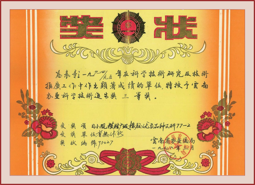 授奖级别 云南农垦科学技术进步奖三等奖