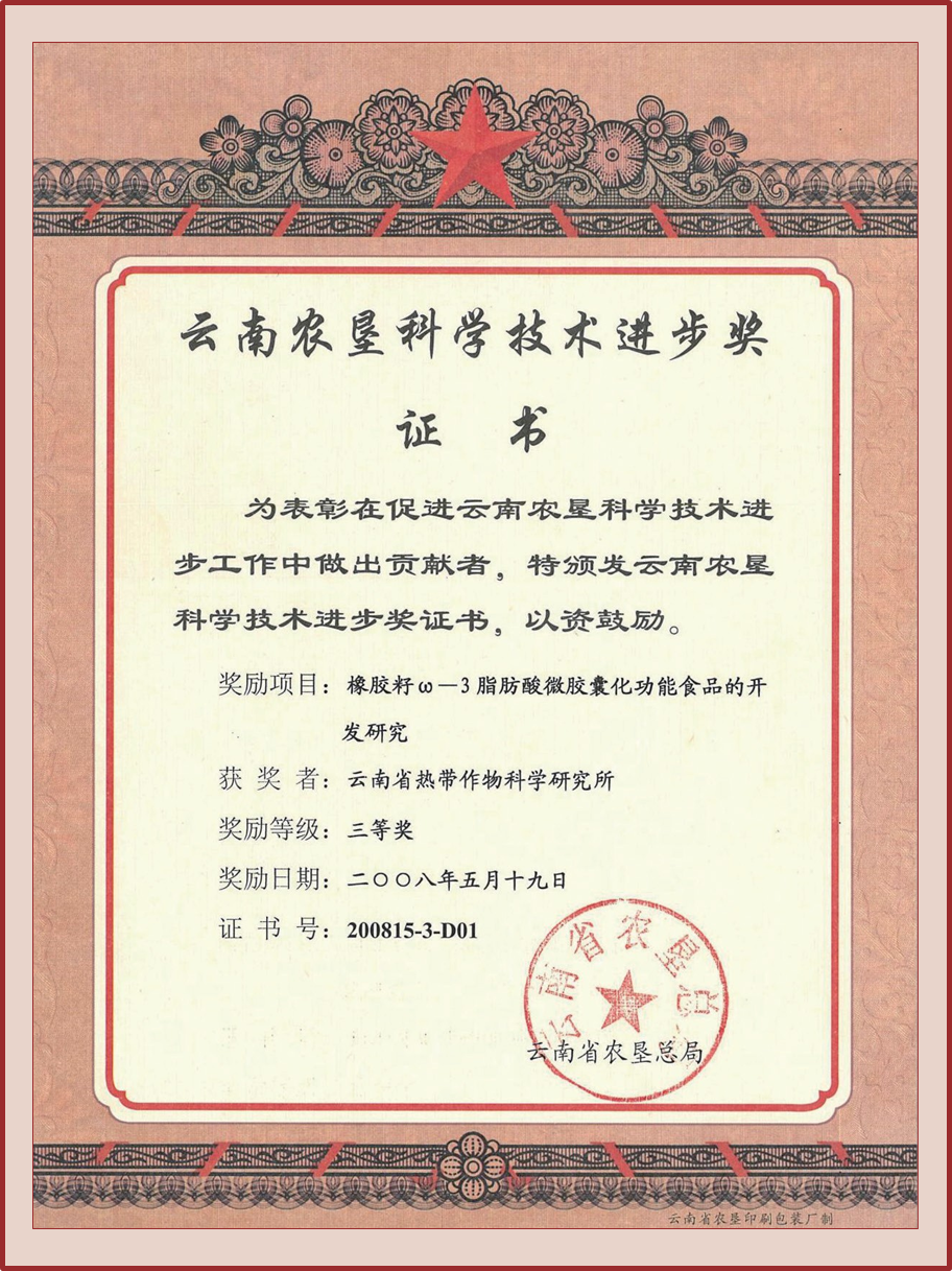 成果简介 20世纪80年代的动物实验及临床治疗证实,橡胶籽油具有降脂效果,对心血管疾病也有预防和治疗效果。该油富含亚油酸(36%)、亚麻酸(20%),尤其是ω-3脂肪酸是降脂的有效成分,但易氧化劣变,贮藏稳定性差。本项目是橡胶籽油“食用、医用研究”的延续和深化,针对橡胶籽油微胶囊化功能食品开发的需求,通过大量的实验工作,成功地提取了酸角T多糖作为壁材和天然黄酮类作为抗氧化剂应用于产品开发,采用喷雾干燥技术,将优质橡胶籽油ω-3脂肪酸进行微胶囊化加工,获得的样品功能性脂肪酸含量大于40%、包埋率达到92.6%、抗氧化稳定性提高2~4倍。该产品的开发为综合开发利用橡胶籽油拓展了新的应用领域。
